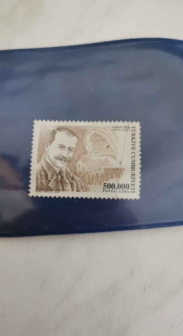 Bu kahverengi ve gri hatıra pulu, Vedat Tek'i tasvir eder ve 500.000 Türk Lirası değerindedir.