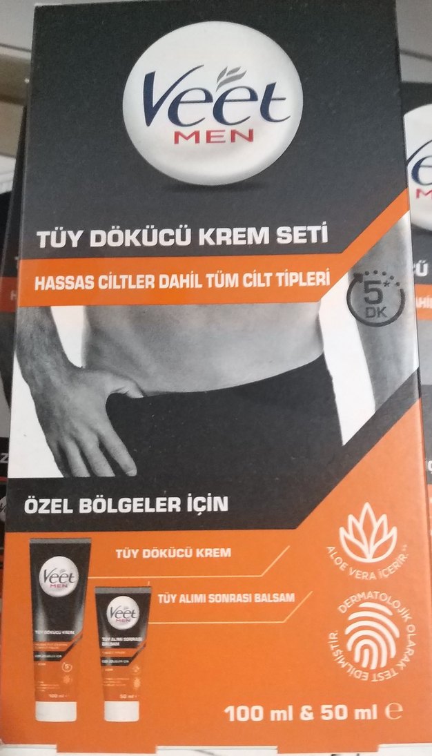 Veet Men tüy dökücü krem seti, hassas ciltler dahil tüm cilt tiplerine uygun krem ve tüy alımı sonrası balsam içerir. Aloe vera ile zenginleştirilmiş, dermatolojik olarak test edilmiştir.