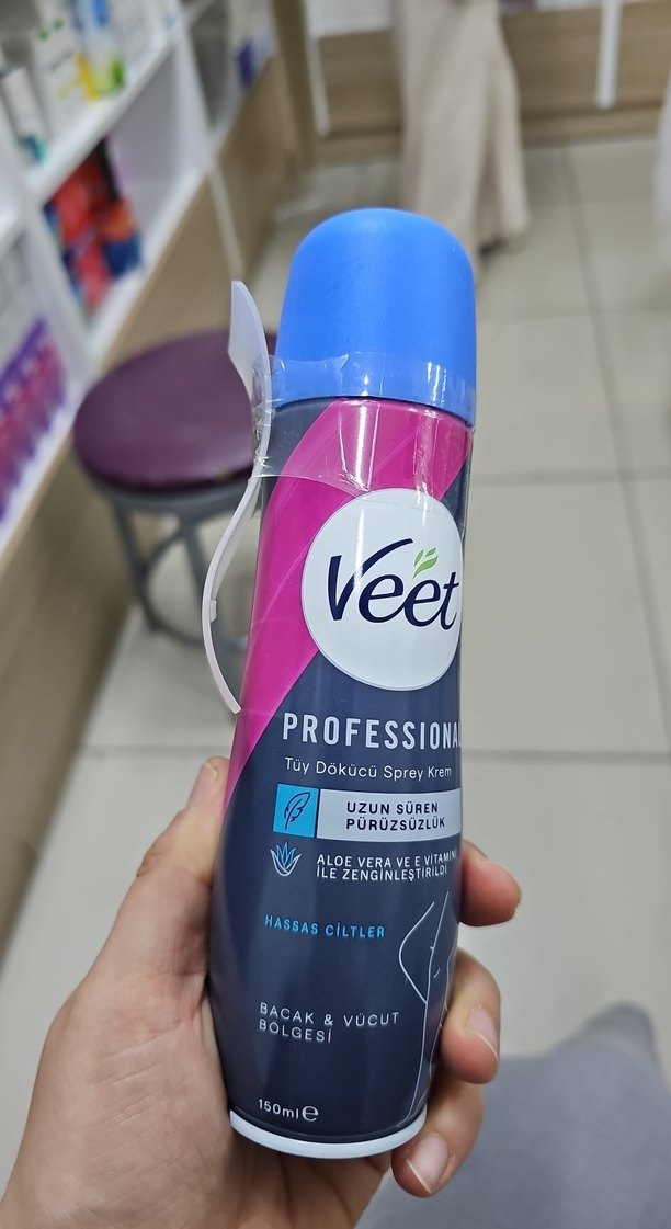 Veet Profesyonel tüy dökücü sprey, hassas ciltler için aloe vera ve E vitamini içerir. Uzun süre pürüzsüzlük sağlar. Bacak ve vücut bölgeleri için uygundur.