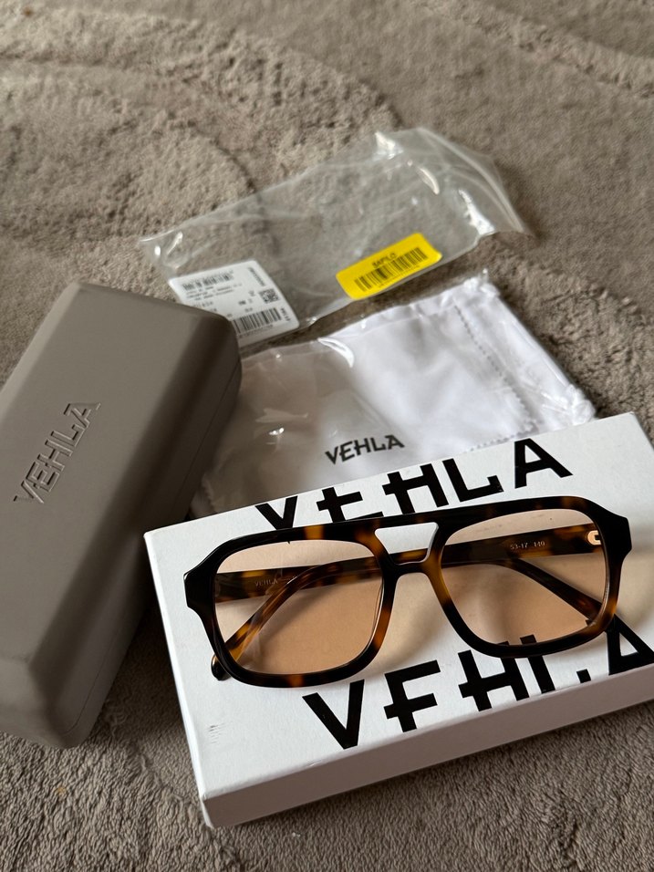 Şeffaf detaylara sahip çağdaş bej kadın gözlüğü, minimalist tasarım EHLA markasından. Korumalı kutu ve orijinal ambalaj ile birlikte gelir.