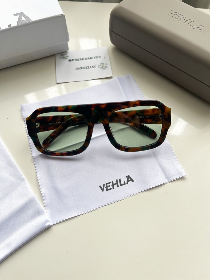 Şeffaf çerçeveli, koyu çok renkli kadın güneş gözlüğü. Minimalist sokak stili ve 'VEHLA' markası detaylarıyla öne çıkar. ️