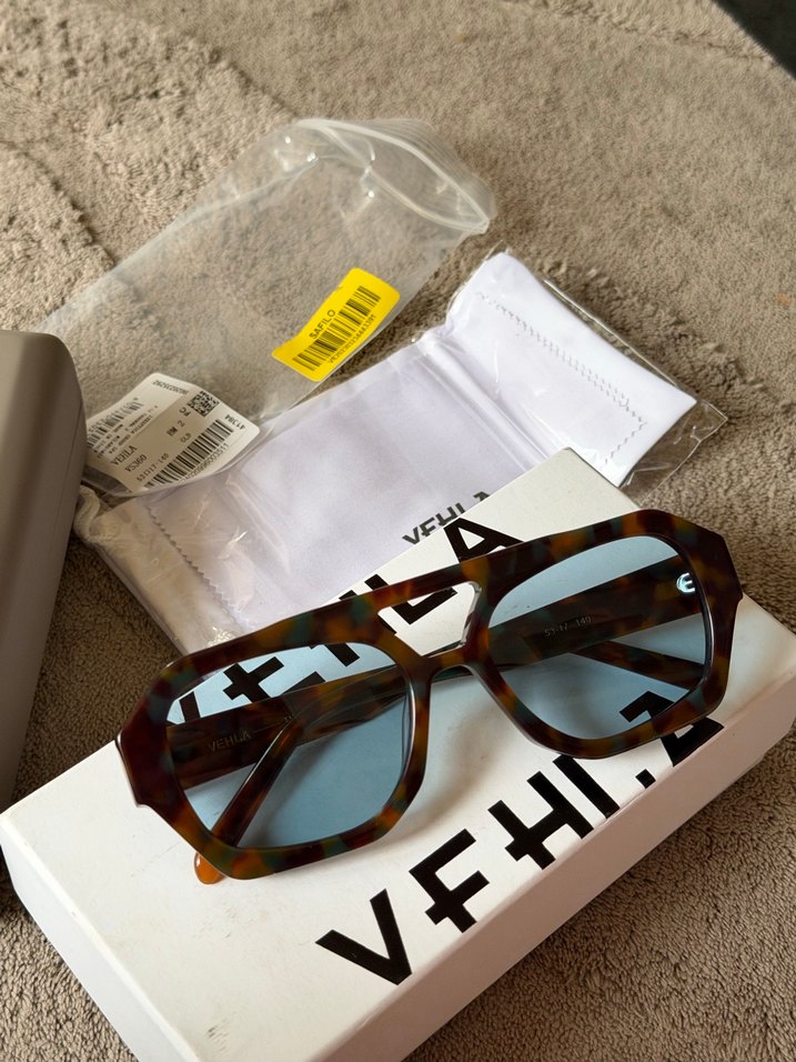 Velcro detaylı bej renkli kadın sokak stili gözlüğü, VFHI yazılı kutu ve koruyucu kılıf ile birlikte.