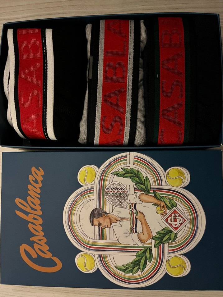 Çok renkli, baskılı ve Velcro bantlı çocuk kemeri. Koyu renkli, counterculture tarzında ve Casablanca baskılı kutuda.