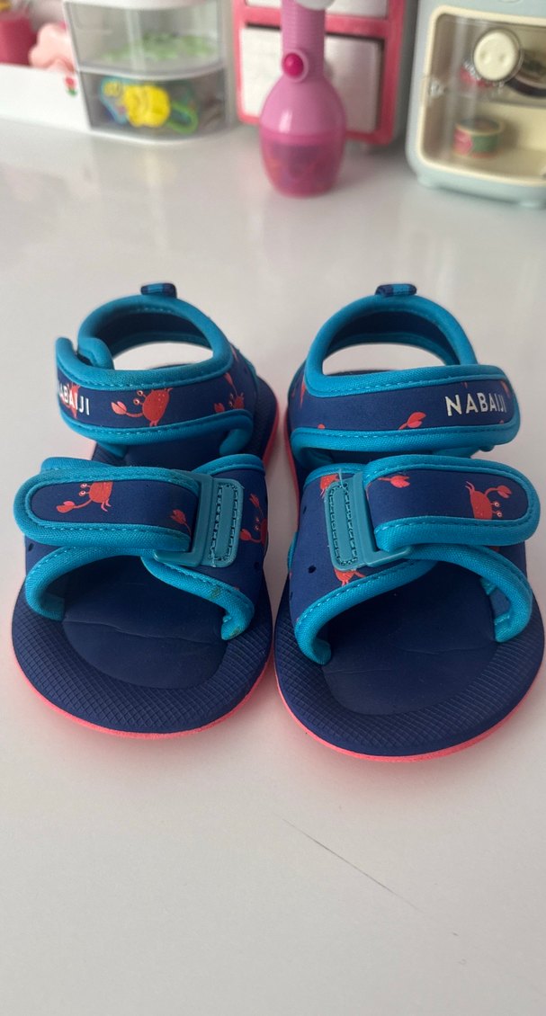 Renkli baskılı, ayarlanabilir velcro bantlı erkek çocuk sandaletleri. Dayanıklı kauçuk malzemeden üretilmiş, rahat sokak stili tasarım. Marka adı "NABA" bantlarda yer alır.