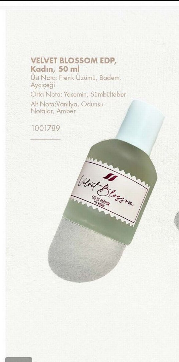 Velvet Blossom kadın parfümü, üst notalarda Frenk üzümü, badem ve ayçiçeği içerir. Orta notalarda yasemin ve sümbülteber, alt notalarda vanilya, odunsu notalar ve amber bulunur. 50 ml şişe.