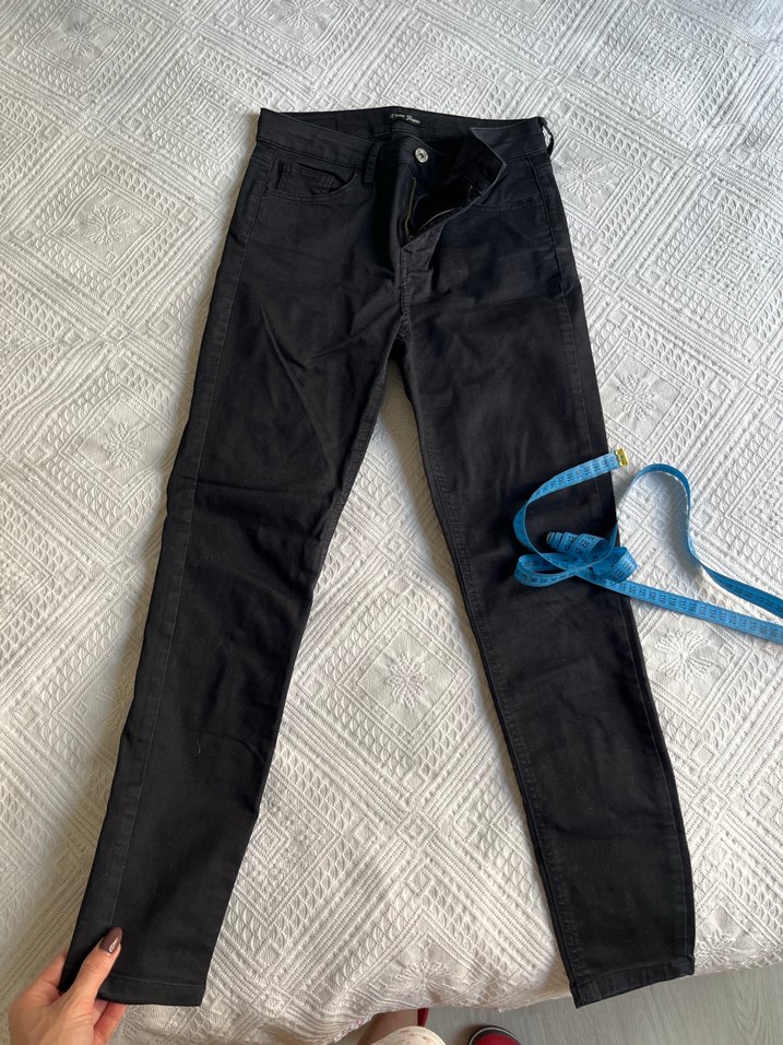 Siyah kot pantolon, normal boyda ve günlük kullanıma uygun sade ve minimalist tarzda.