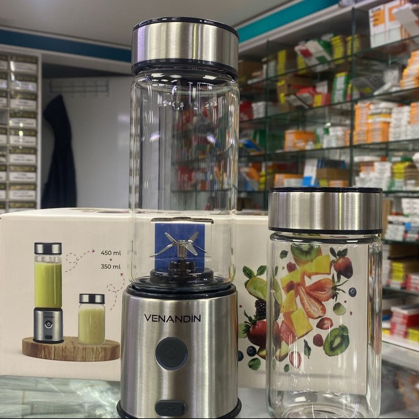 Venandin blender, paslanmaz çelik taban ve mavi düğme ile birlikte iki cam hazne, 450 ml kapasiteye kadar karıştırma yapar.