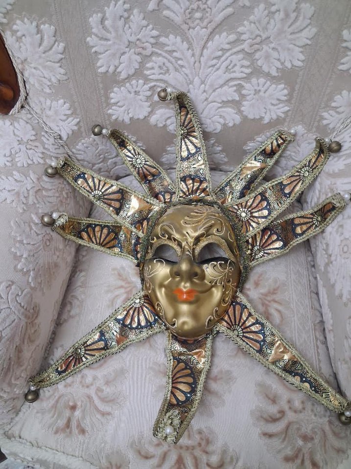 Detaylı altın süslemeli, renkli desenli uzantıları olan Venedik tarzı jester maskesi.