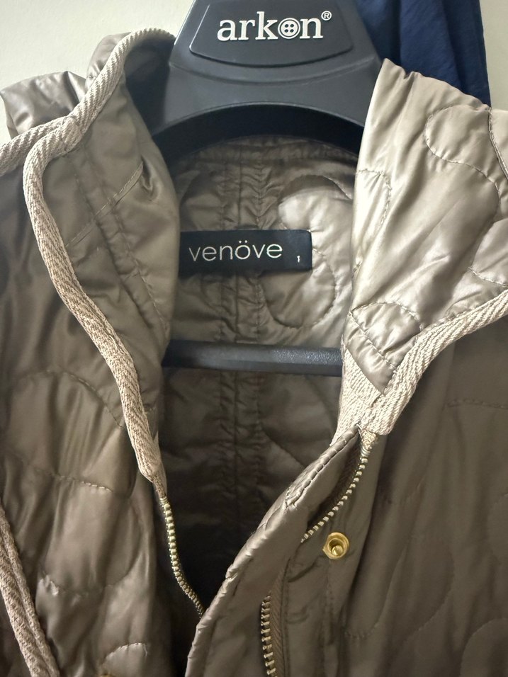 V yaka, uzun kollu, kahverengi, sentetik kumaştan yapılmış, fermuarlı ve normal uzunlukta kadın kışlık mont. Rahat ve şık bir tasarım sunar.