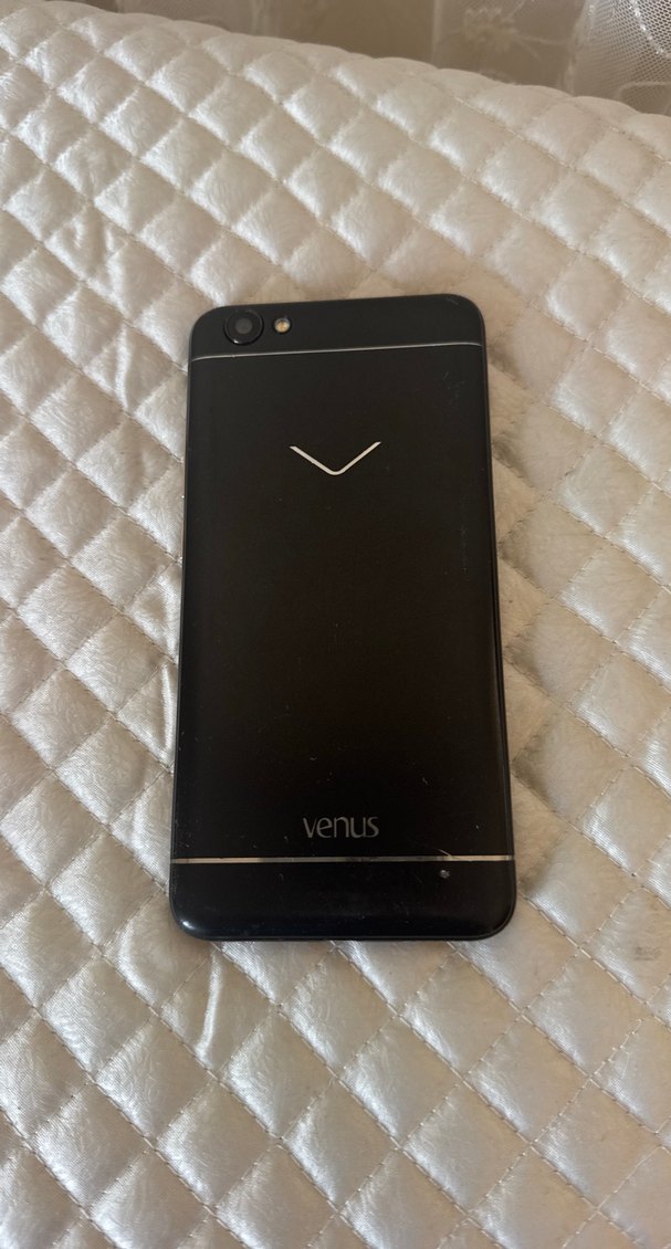 Arka kameralı ve şık tasarımlı siyah Venus Android telefon. Koyu renkte ve arka yüzde Venus logosu bulunur.