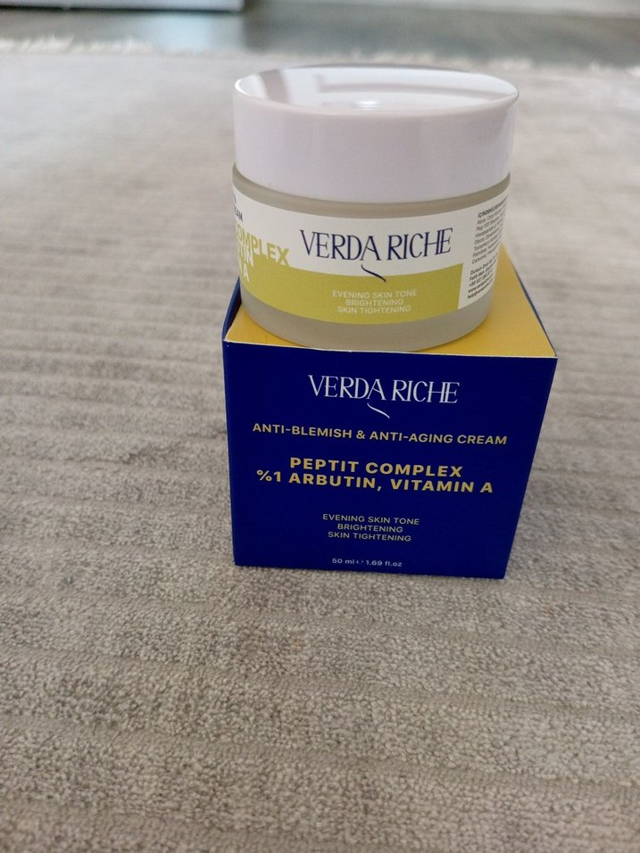 Verda Riche Peptit Complex, %1 Arbutin ve Vitamin A içeren kırışıklık ve leke karşıtı krem, cilt tonunu eşitler ve sıkılaştırır. Ürün hiç kullanılmadı.