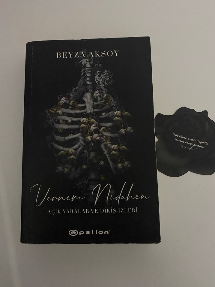 Beyza Aksoy'un "Vernem Nidahen" adlı romanı, açık yaralar ve dikiş izleri temalarını işleyerek duygusal derinlik sunuyor. Kitabın yan kısımları biraz siyah.