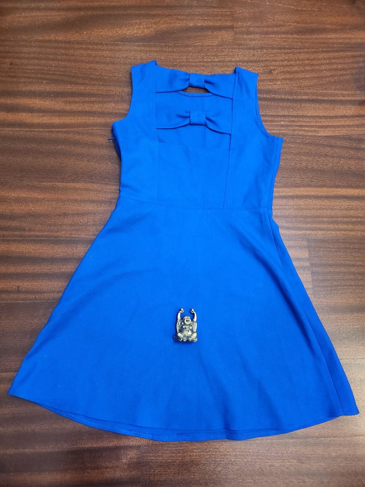 VERO MODA FİYONKLU ELBİSE Renk mavi Beden 36 Yüzde 65 polyester -32 viscose-3 elastane Ölçüler 32cm.omuz en 44cm.koltukaltı en 35cm.bel en 52cm.elbise bitiş en 85cm.boy Kolsuz, beli oturan ve mavi kumaştan yapılmış, sırtı fiyonk detaylı elbise. #veromoda #veromodaelbise #elbise #davet