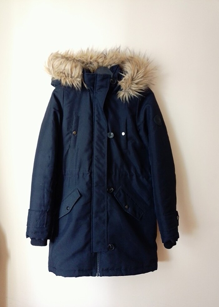 Çok sıcak tutan rahat bir mont. xs beden fakat s beden için uygundur. Ben şu an m bedenim biraz küçük olduğu için kullanamıyorum. Rengi siyaha yakın çok koyu lacivert (fotoğraftan daha koyu) Kapüşonundaki kürk çıkarılabiliyor, içten gizli düğmeleri var. Bel kısmından sıkılabilir ayarı var. Hem alt hem de göğüs kısmında cepleri var çok kullanışlı. Kaliteli bir mont.