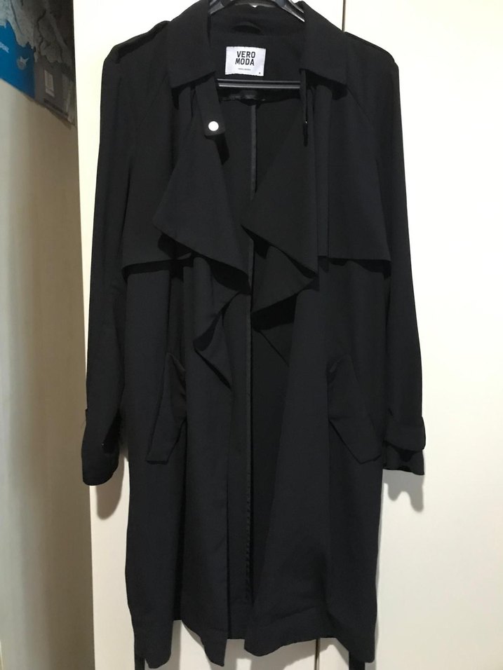 Vero Moda siyah uzun trençkot, drapeli tasarımı ve notched yaka ile dikkat çeker. Uzun kollu, bol kesim ve sentetik kumaştan ofis için uygundur.