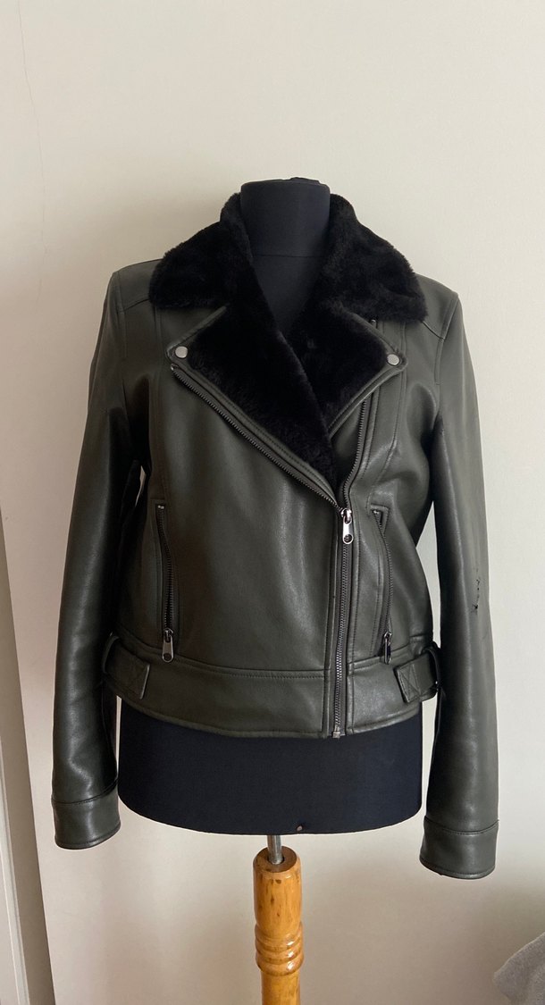 Vero Moda yeşil kürklü deri ceket, sol kolunda soyulma mevcut
