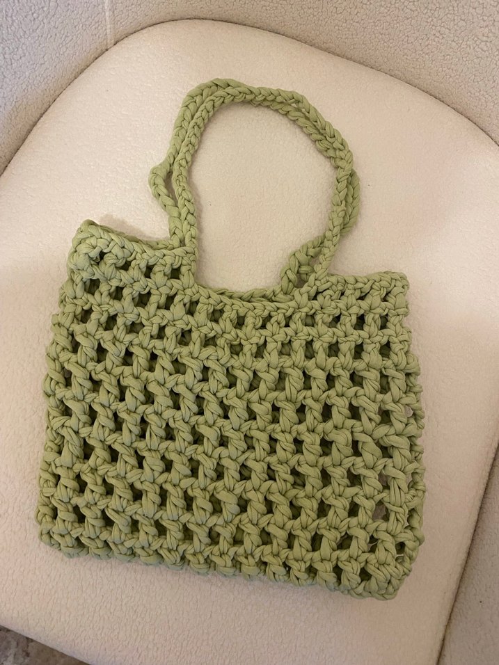 Yeşil örgü kadın çanta, bohem tarzda, yumuşak ve rahat dokuda. Desensiz tasarımı ve pastel tonu ile günlük kullanıma uygun. Kendi el örgümdür