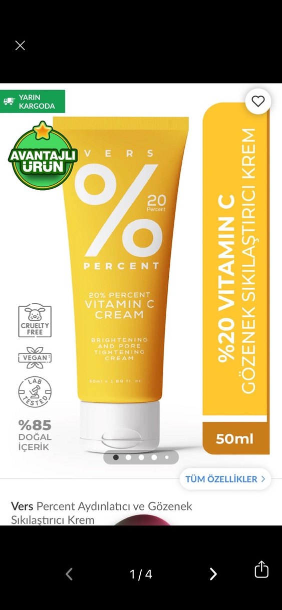 %20 vitamin C içeren, gözenek sıkılaştırıcı ve aydınlatıcı özellikli. %85 doğal içerikli, cruelty-free, vegan ve 50ml krem. Sıfır ürün