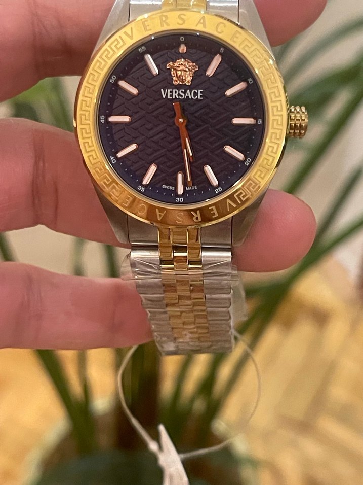 Versace markalı kadın saati, altın renk zincir detaylı bilezik ve koyu klasik kadran ile modern klasik şıklığı bir araya getirir. ⌚