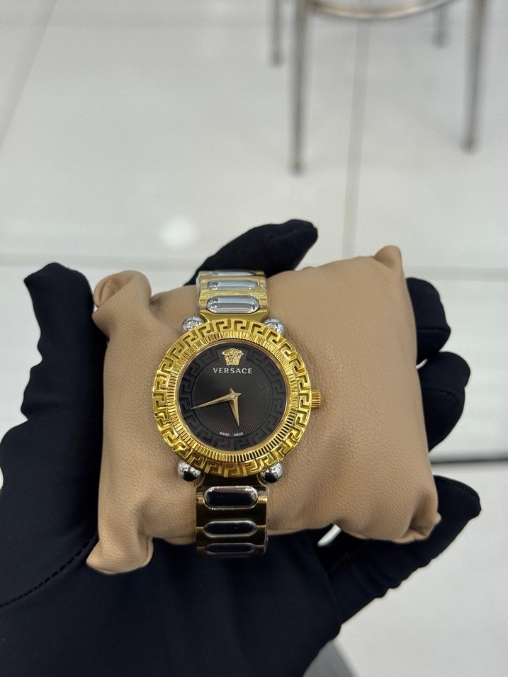 Versace marka, koyu altın renkli, kemerli tasarıma sahip modern klasik kadın saati. Siyah kadran ve altın renk çerçeve uyumu ile öne çıkar. ⌚