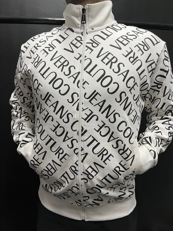 Fermuarlı ve bisiklet yaka, beyaz zemin üzerinde gri Versace baskılı, sentetik kumaştan erkek sweatshirt.s/m/l/xl/xxl