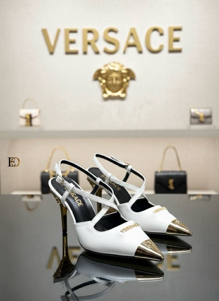 Versace beyaz parlak yılan desenli stiletto, tokalı kayışlarla ve metal uç detaylı. Ofis için çağdaş ve gösterişli tarzda uygun.