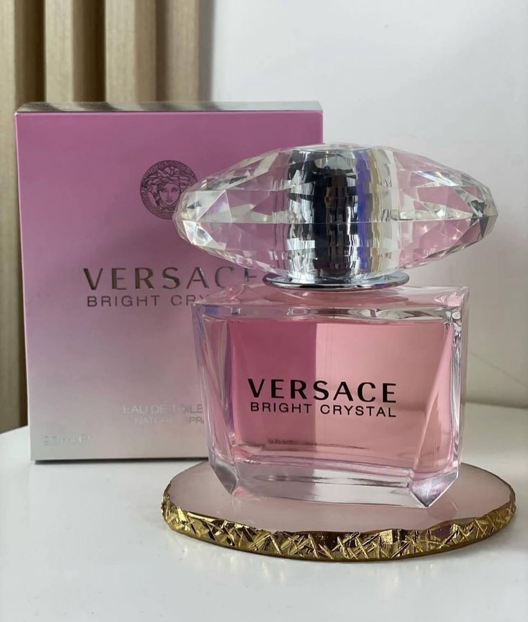 Versace Bright Crystal kadın parfümü, 90 ml şişede pembe sıvı ve kristal görünümlü kapak ile sunulmaktadır. Ambalajı açık pembe ve Versace logosu yer alır.