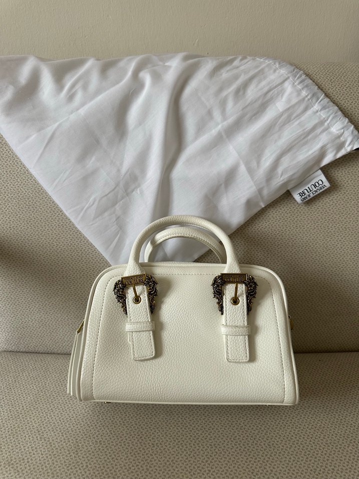 Beyaz deri, tokalı detaylara sahip modern klasik tasarımda kadın çantası. Paris tarzını yansıtır, günlük kullanıma uygundur.