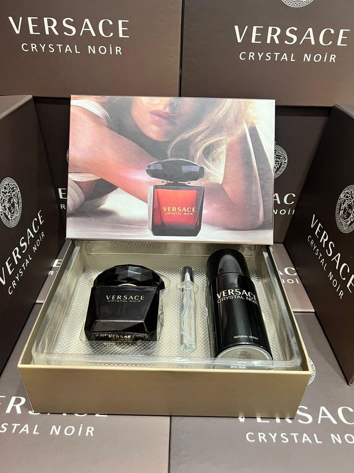 Versace Crystal Noir kadın parfüm seti, şık koyu renkli parfüm şişesi, seyahat sprey ve uyumlu vücut spreyi içerir.