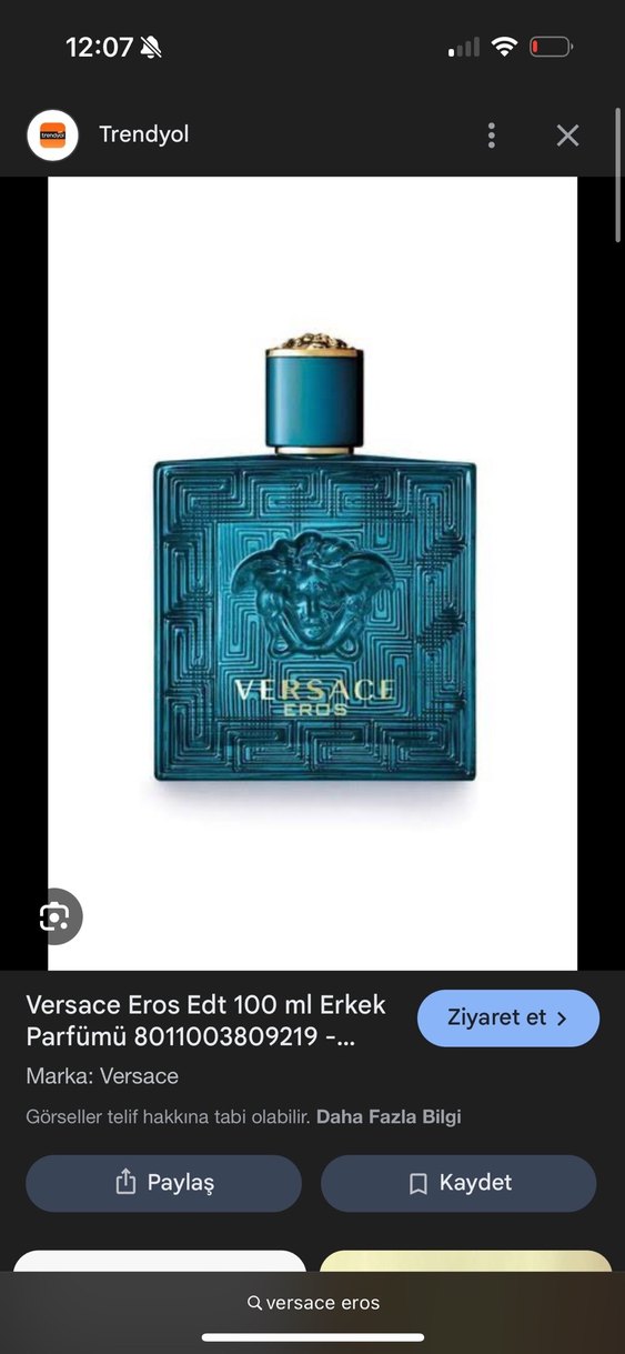 Versace Eros EDT, parlak turkuaz renkte, Medusa figürlü şık şişede 100 ml erkek parfümüdür. Modern klasik tarzda.