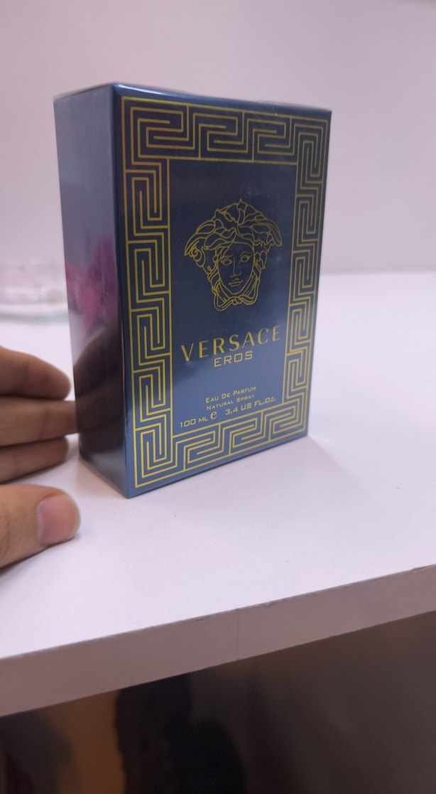 Versace Eros erkek parfümü, koyu altın renkli kutuda, modern klasik tarzda 100 ml Eau de Parfum yoğunluğunda sunuluyor.