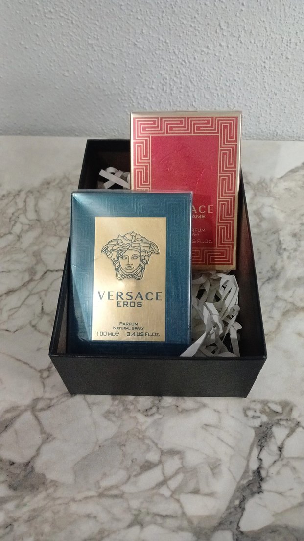 Versace Eros erkek parfümü, koyu mavi ve altın renkli şişede, vintage esintili modern klasik tasarımda sunuluyor. IKILI FIYATTIR.