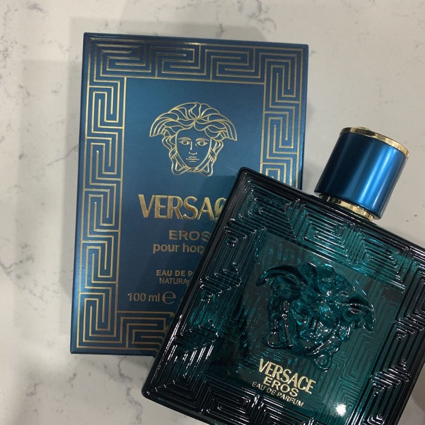 Versace Eros erkek parfümü, parlak mavi şişede, modern klasik tarzda ve 100ml hacminde. Eau de parfum formülasyonu içerir.