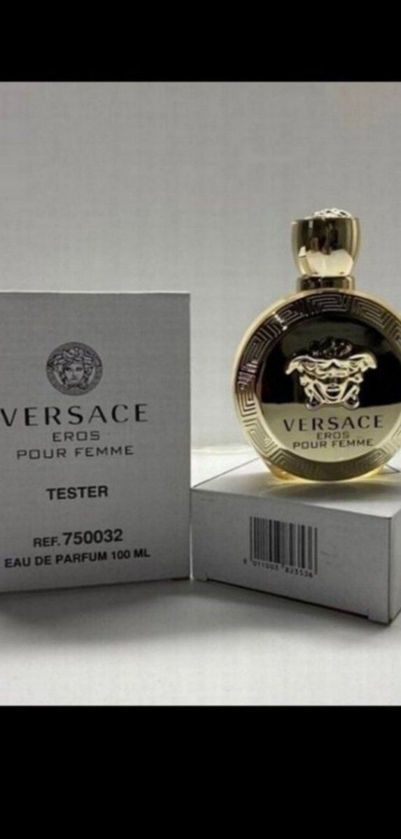 Parlak altın şişede Versace Eros Pour Femme, modern klasik tarzda 100ml Eau de Parfum kadın parfümü. Tester kutusunda.