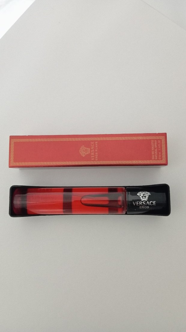 Versace Eros erkek parfümü, 10 ml sprey şişede, kırmızı ve siyah tasarıma sahip. Ambalajı kırmızı ve altın detaylıdır.