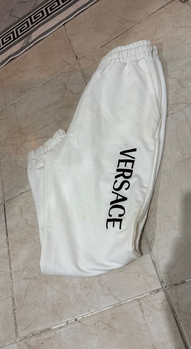Beyaz, bol kesim kadın eşofman altı, gri baskılı Versace logosu ve cırt cırt detaylarıyla. Yumuşak ve sıcak kumaştan, günlük kullanım için uygun.