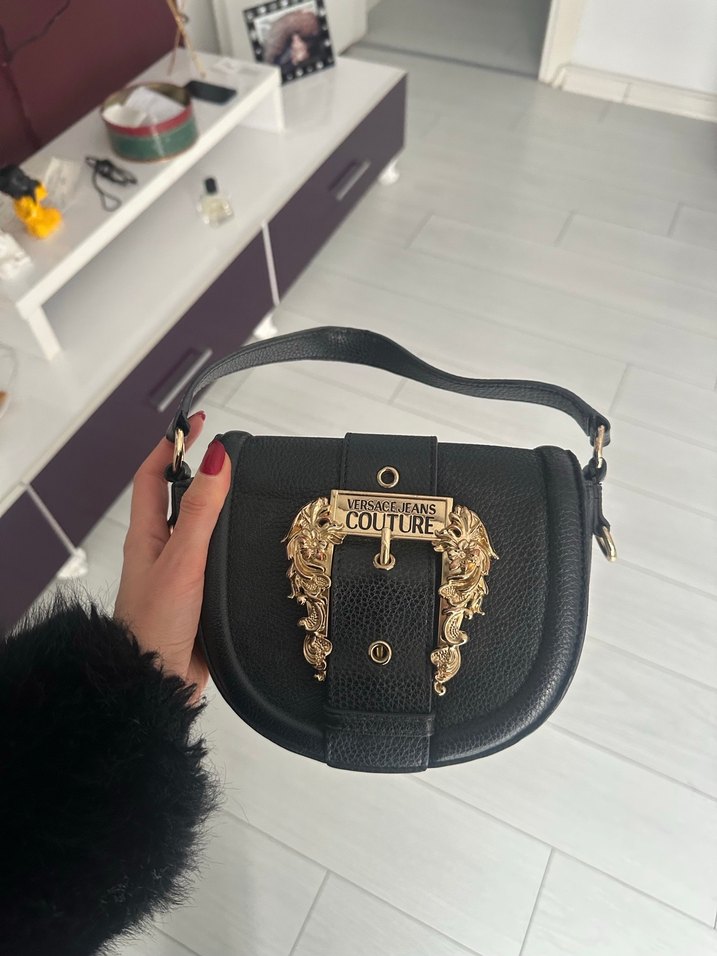 Versace Jeans Couture siyah deri kadın çanta, parlak altın tokalı detaylarla modern klasik ve Paris şıklığını yansıtıyor. Günlük kullanıma uygun.