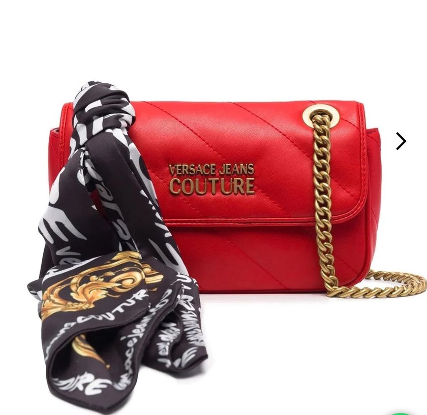 Sayılı kullanıldı.Versace Jeans Couture kırmızı çanta, baskılı zincir askı ve şık fular detayıyla sokak modasına uygun.