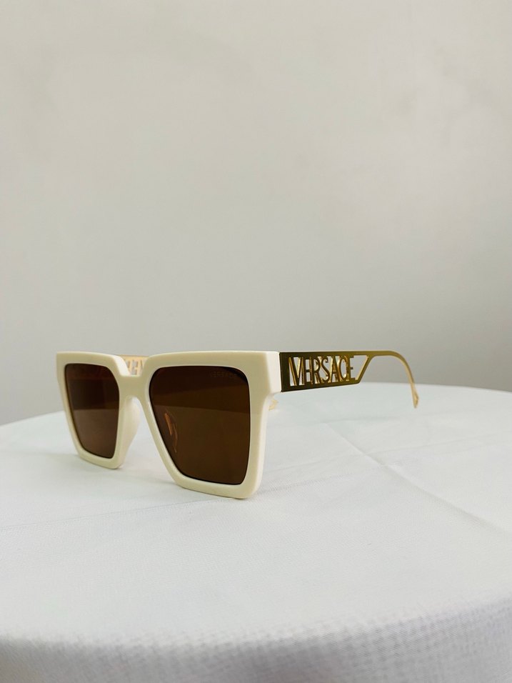 Minimalist ve avangart sokak stili için, parlak beyaz transparan çerçeveli, yanlarında Versace logosu bulunan kadın güneş gözlüğü. ️