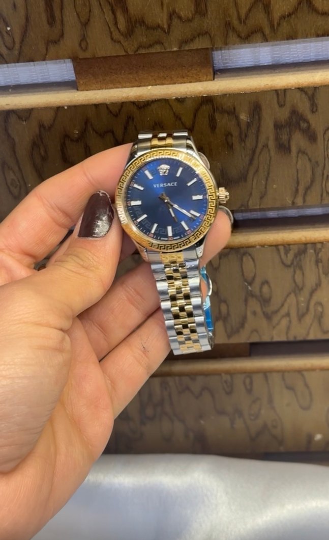 Versace kadın saati, parlak altın renkli tokalı kayış ve mavi kadranıyla modern klasik tasarıma sahiptir. Klasik zarafeti sevenler için ideal. ⌚