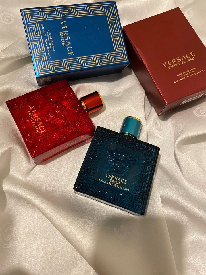 Canlı kırmızı ve mavi şişelerde, modern klasik tarzda iki Versace erkek parfümü seti. Kırmızı şişe Versace Eros Flame, mavi şişe Versace Eros Eau de Parfum içerir. “%100 orijinal, bandrollü ve barkodlu parfümler ✨ Güvenle alışveriş yapabilirsiniz. Sahteye son, orijinale evet ✅” ADET FİYATI