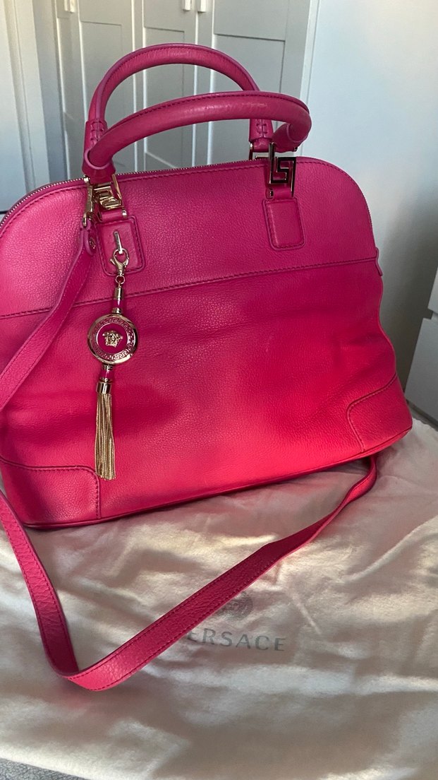 Püsküllü detaylı, parlak pembe deri kadın çanta. Baskılı desenli, VERSACE Orijinal markalı. Modern klasik ve Paris tarzı, günlük kullanım için uygundur. Etiketi mevcut fakat kopmuş , arkası beyaz görülmeyen bir leke var ama o sorun değil