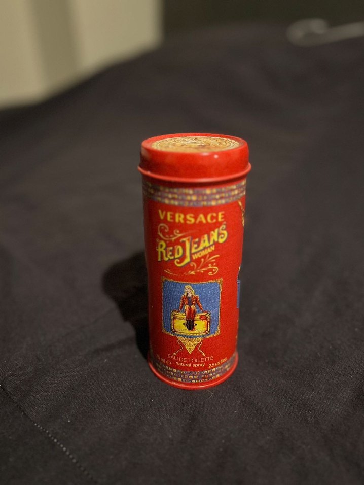 Versace Red Jeans kadın parfümü, kırmızı silindirik şişede. Kullanılan kısım belli oluyor. Son zamanlarda kullanmayı bıraktığım için satıyorum