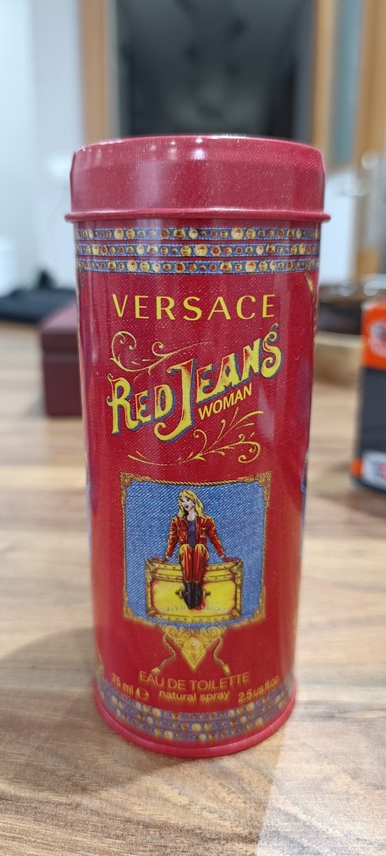 Versace Red Jeans Woman 75 ml Eau de Toilette, kırmızı dekoratif şişede kadın parfümü.