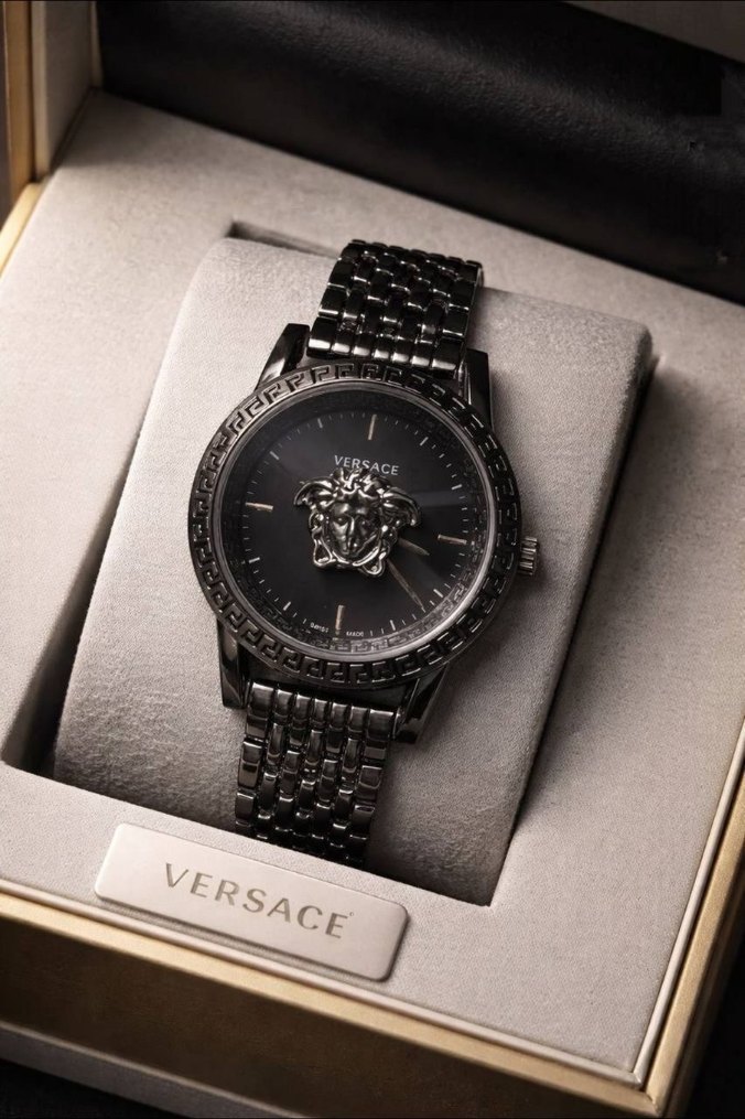 Versace marka, siyah gotik tarzda, tokalı metal kayışlı kadın saati. Kadranda Medusa figürü ve klasik zarafet barındırır. ⌚