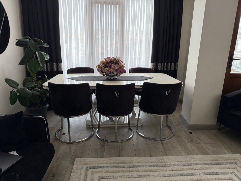 Lütfen standart eşyalar ile kıyaslamayın VERSACE marka çok özel ağır ve şık bir model. Çok kaliteli ve kesinlikle ayaklar ve detaylar paslanmaz krom ile yapılmış lake masa. Göründüğü gibi zaten sandalyeleri anlatmama gerek yok çok eşsiz bir model . Beyaz masa ve koyu siyah sandalyelerle modern ve şık bir yemek alanı oluşturulmuştur. Tümü 60 bin tl.