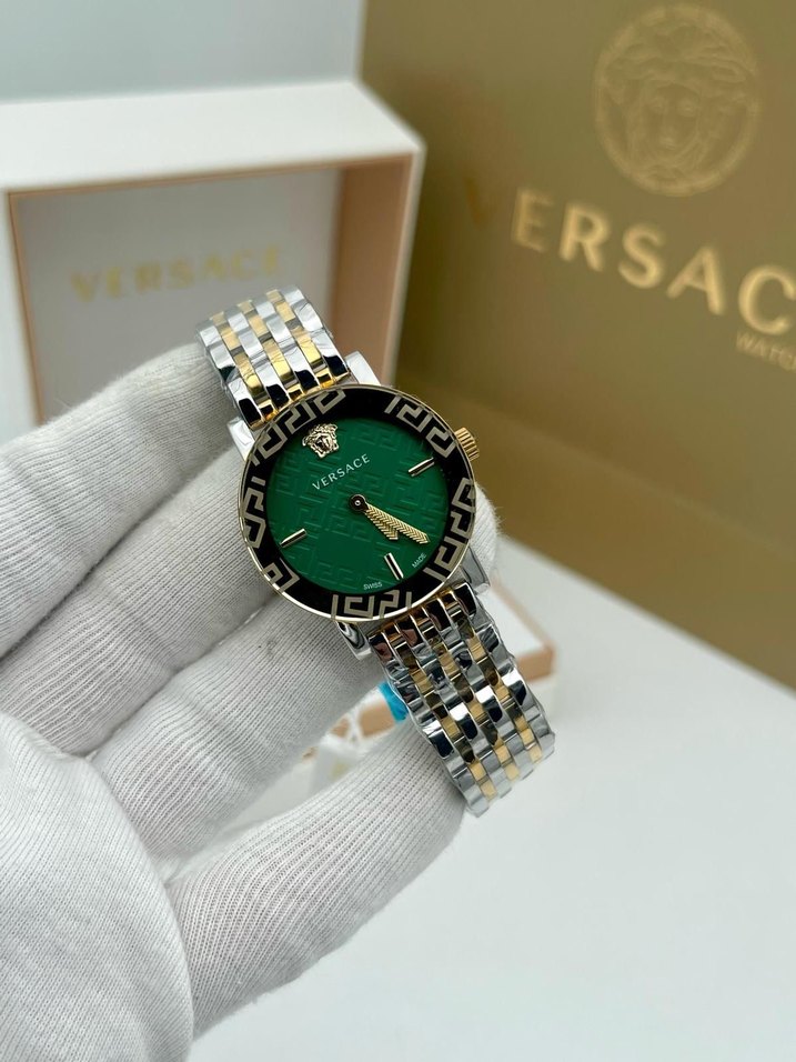 Versace kadın saati, yeşil desenli kadran ve iki renkli metal bilezikle klasik ve modern tarzı bir araya getirir. Kadranda Versace logosu ve Yunan anahtarı deseni bulunur. 1. Kalite ⌚