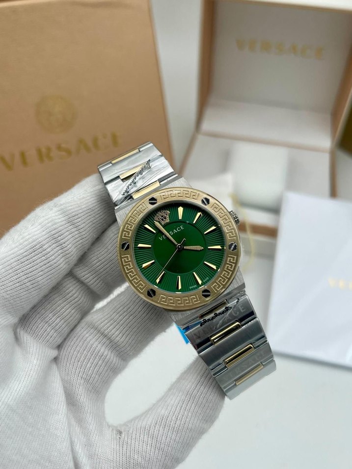 Versace kadın saati, canlı yeşil kadran ve kemerli gümüş tonlu bilezikle. Altın detaylı modern klasik tasarıma sahip. ⌚