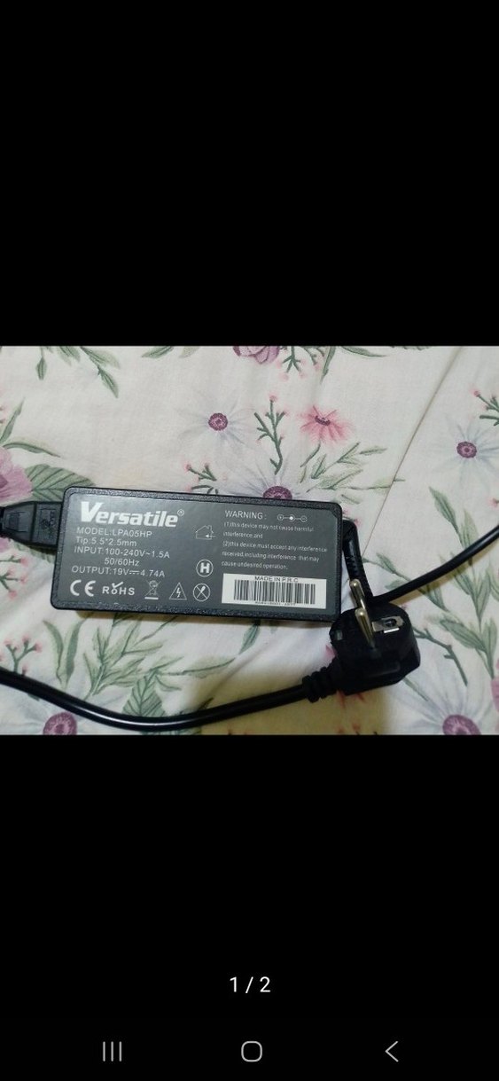Versatile yeşil şarj adaptörü, 19.5V çıkış ve 4.74A akım sağlar. 100-240V giriş ve 50/60Hz frekans uyumludur. Güvenlik sertifikalarına sahiptir.