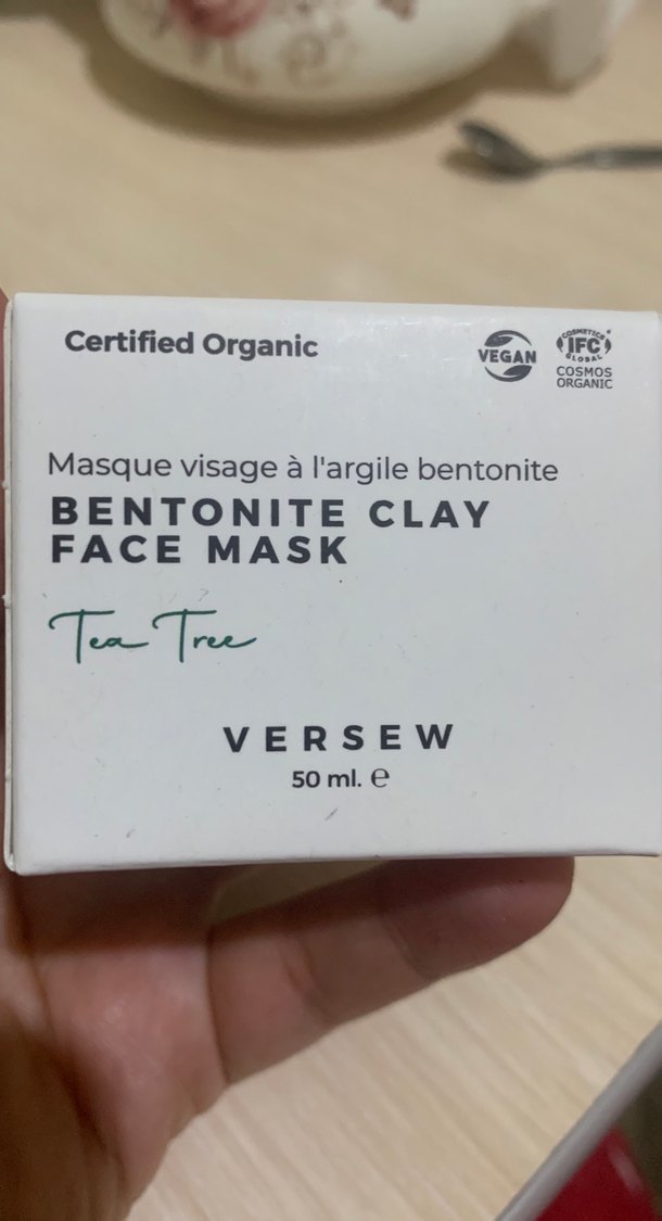 Versew markasına ait, organik sertifikalı ve vegan özellikli, çay ağacı içeren 50 ml Bentonite kil yüz maskesi.
